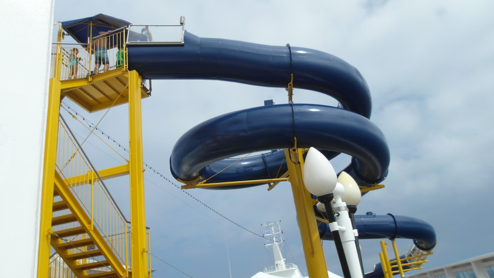 This is the top deck where there is a swimming pool, Jacuzzi, and a long slide.